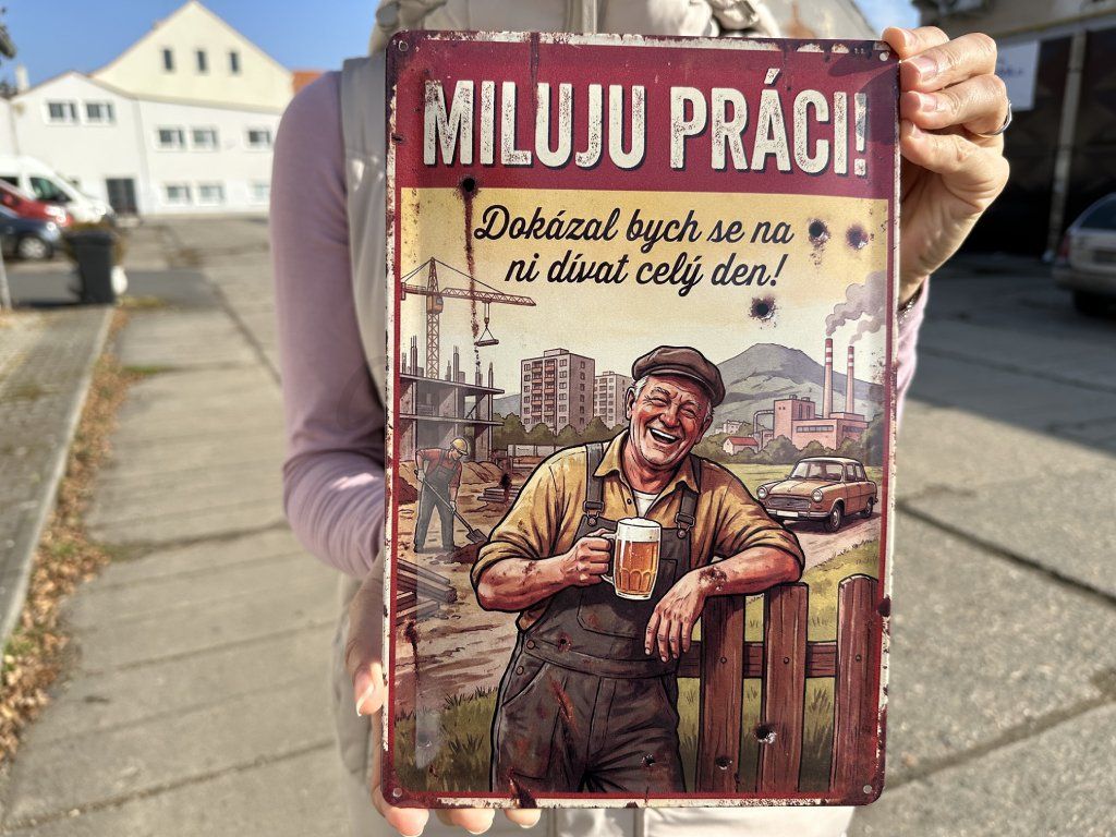 🍺 Plechová cedule: „Miluju práci“ – Pro ty, co se práce nebojí (přiblížit)
