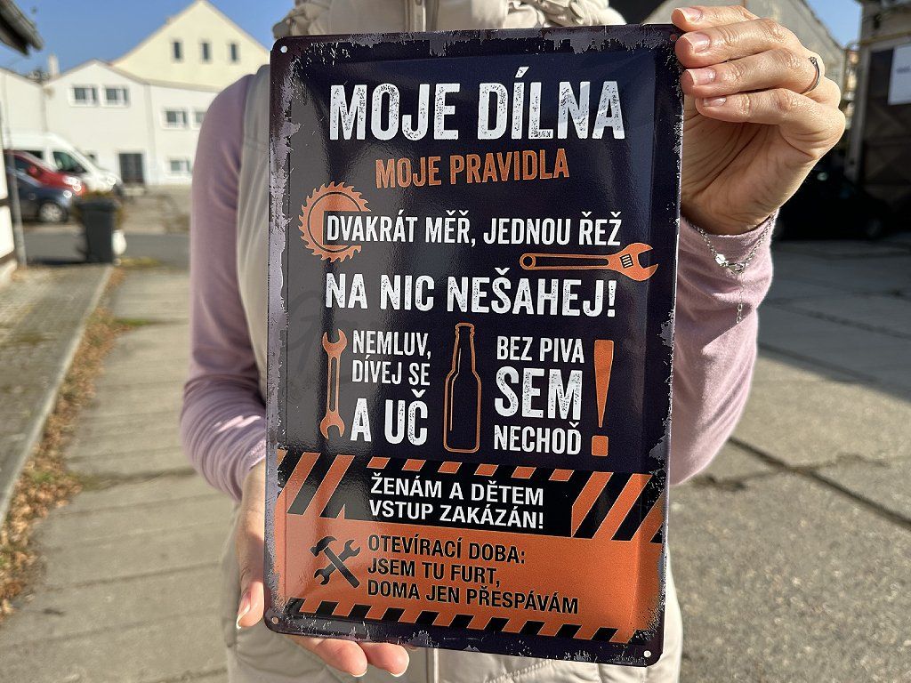 Zavěste ji tam, kde se tvoří, piluje, řeže a přemýšlí. Tahle cedule mluví za vás – a každý hned pochopí, že tady platí vaše pravidla.