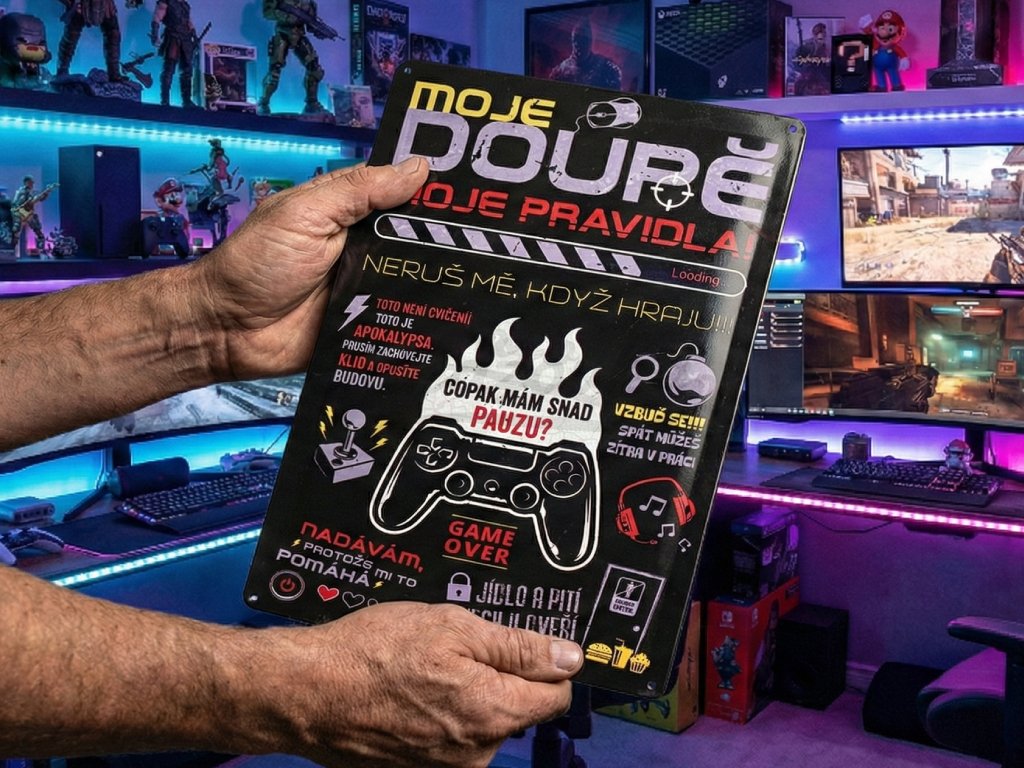 Patříš mezi hráče, kteří to berou vážně? Pak je plechová cedule „Moje doupě – moje pravidla!“ přesně pro tebe. Už žádné zbytečné vyrušování – tady platí jasná pravidla: „Neruš mě, když hraju!!!“, „Copak mám snad pauzu?“ nebo „Vzbuď se! Spát můžeš zítra v práci.“ Každý, kdo se přiblíží, hned pochopí, že jde o vážnou misi – žádný trénink, ale rovnou apokalypsa!