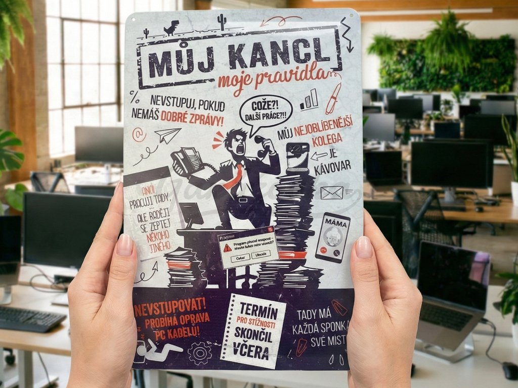 Humorné texty jako „Nevstupuj, pokud nemáš dobré zprávy!“, „Můj nejoblíbenější kolega je kávovar“ nebo „Termín pro stížnosti skončil včera“ rozesmějí každého, kdo ví, jak to v kanceláři chodí. Cedule vystihuje každodenní realitu pracovního života s lehkostí a nadsázkou.