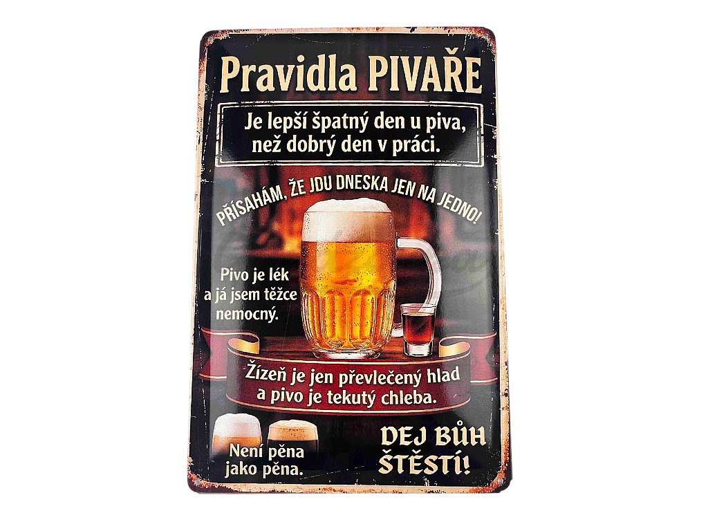 Máte doma nebo v garáži někoho, kdo říká „jdu jen na jedno“ a vrátí se za svítání s filozofickou přednáškou o pěně? Pak je tato plechová cedule „Pravidla PIVAŘE“ absolutní nezbytností.